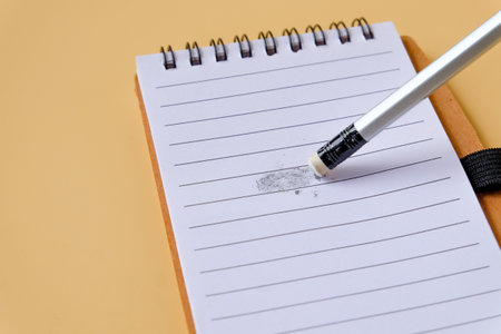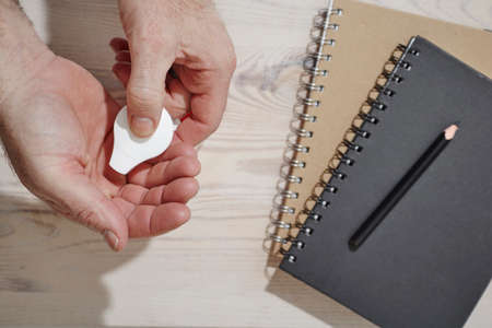 hand using an eraser on a notebook, pencil on the table