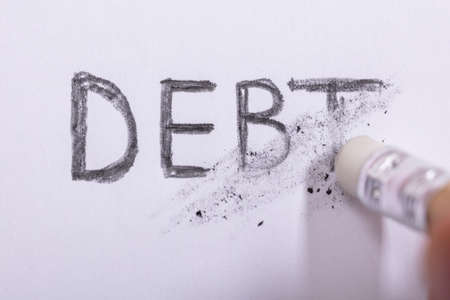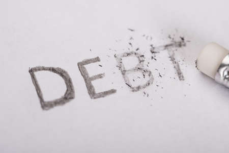 Close-up Of Pencil Eraser Erasing Debt Word On White Paper