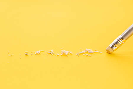 Pencil eraser working on yellow paper background. Mistake, erasing or correction concept. Copy space