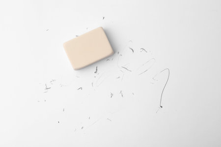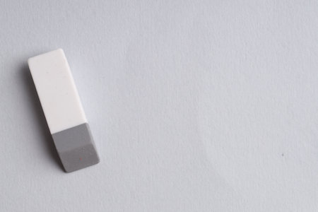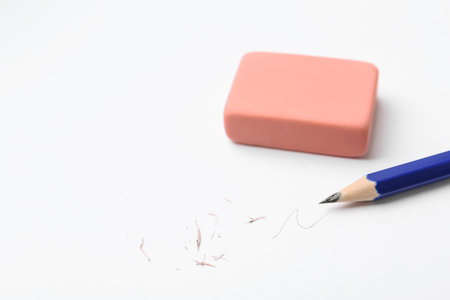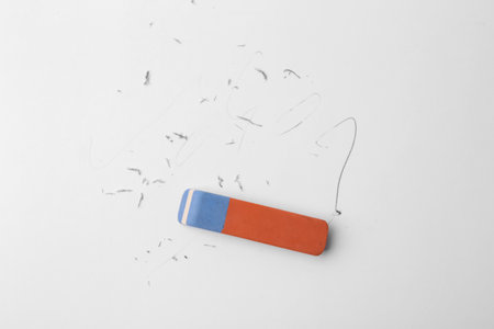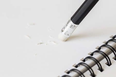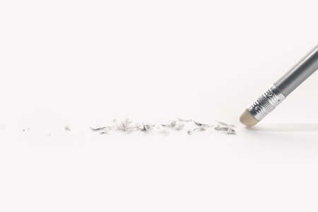 Pencil eraser working on white paper background. Mistake, erasing or correction concept. Copy space