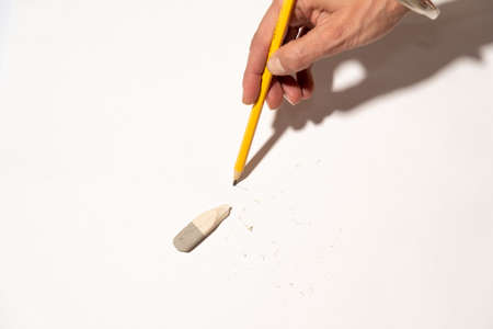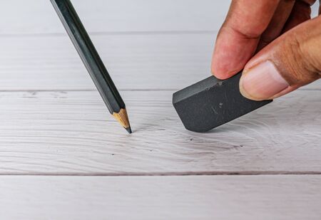 Eraser and error concept, Hand with black eraser and pencil on white table, Mistake erase concept