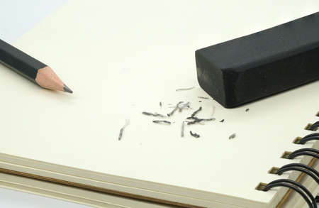 Eraser with traces of dust and graphite and a pencil on book.
