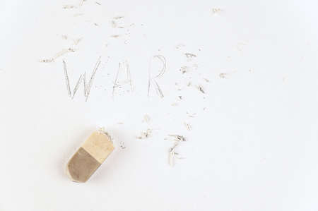 Half-erased with an eraser is the word WAR. Handwritten word on white paper.