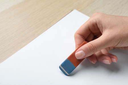 Eraser and error concept, Hand with white eraser on white paper, Mistake erase concept