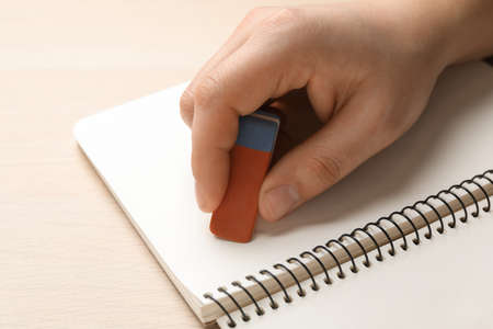 Man erasing something in notebook at wooden table, closeup