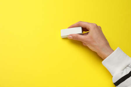 Woman erasing something on yellow background, closeup. Space for text