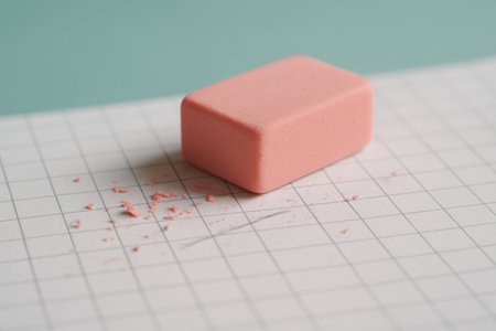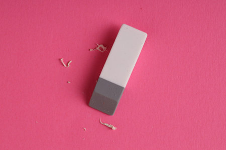 Rectangular pink eraser resting on white grid paper with eraser shavings, closeup view in soft natural light.