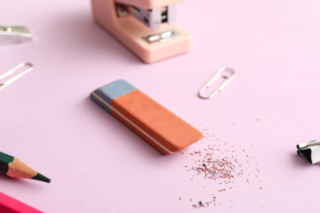 School eraser on lilac background