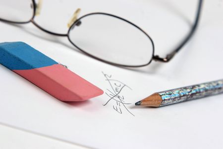 eraser removing a written mistake on a piece of paper.