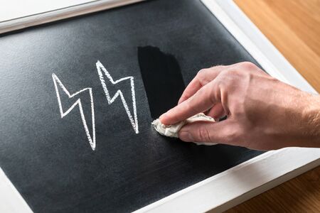 Energy, electricity and power saving concept. Ecology, sustainable development and efficient consumption. Conservation of nature. Electric bill. Hand wiping off lightning icon. Blackboard, chalkboard.