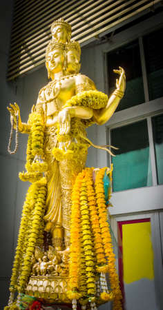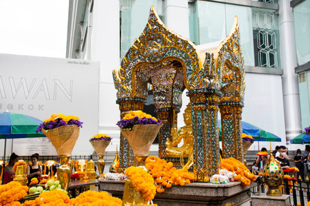 Trimurti or Erawan Shrine at Central World in Bangkok Downtown, urban city, Thailand. Holy famous tourist attraction architecture in travel concept. Landmark monument in Ratchaprasong