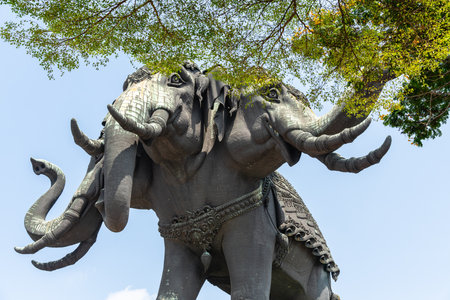 The 3 headed elephant statue of the Erewan Elephant Museum and temple in Samut Prakan nea the city of Bangkok in Thailand in Southest Asia. rThailand, Bangkok, November, 2019