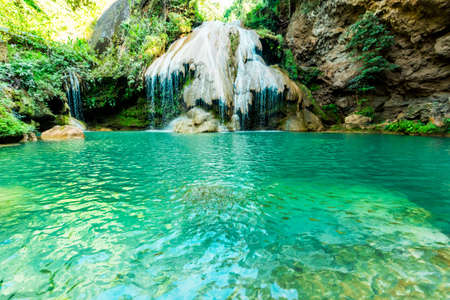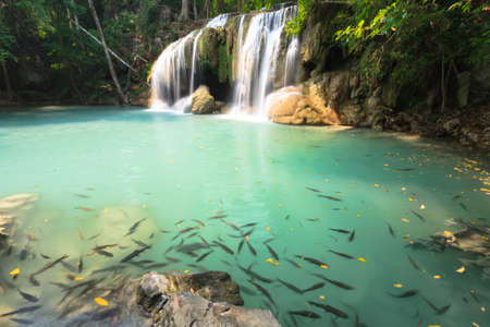 Waterfalls and fish swim in the emerald blue water in Erawan National Park. Erawan Waterfall is a beautiful natural rock waterfall in Kanchanaburi, Thailand.Onsen atmosphere. soft focus.