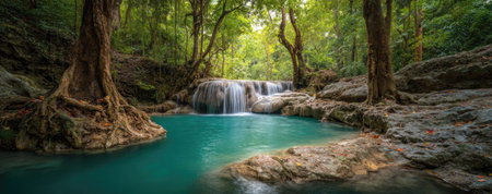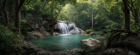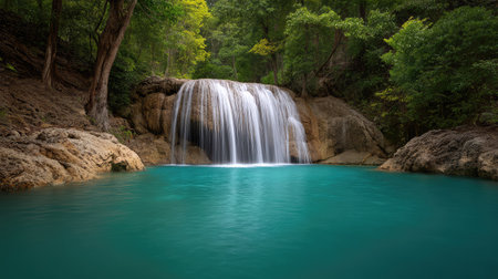 A cascading waterfall empties into a turquoise pool within a dense forest. The image showcases natural textures with a soft focus on flowing water and verdant foliage. The composition and lighting suggest a daytime setting, suitable for various editorial and commercial applications. The scene evokes feelings of peace and natural beauty.