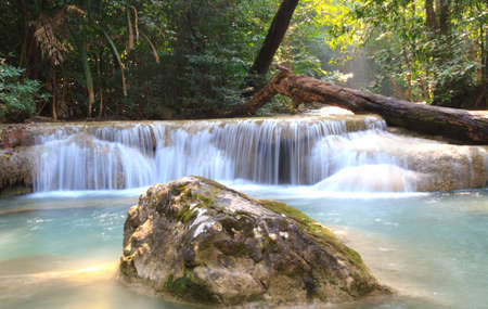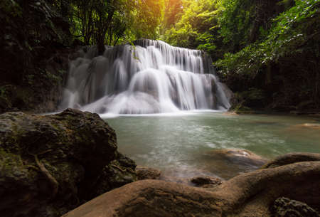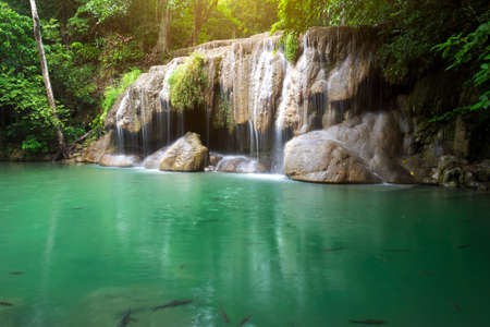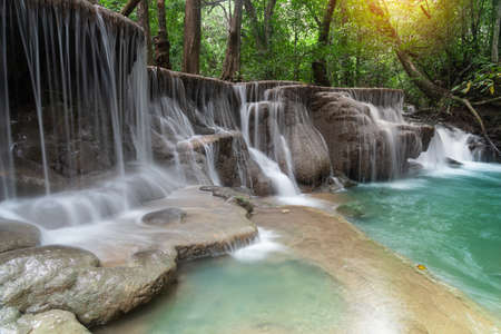 Deep forest waterfall at Erawan waterfall, beautiful waterfall with sunlight rays in deep forest, Erawan National Park in Kanchanaburi, Thailand