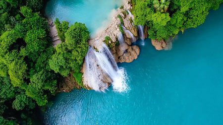 Top-down view of waterfalls cascading over rocky cliffs into a vibrant turquoise pool, framed by dense green trees and vegetation.