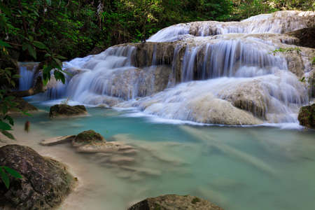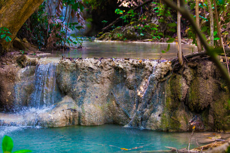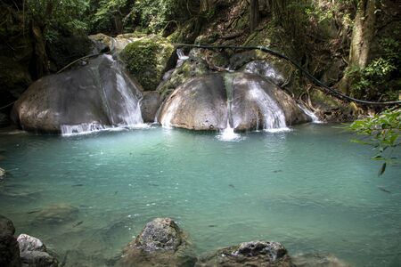 Jangle landscape with flowing turquoise water of Erawan cascade waterfall at deep tropical rain forest. National Park Kanchanaburi, Thailand