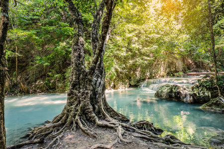 Fantasy majestic forest landscape with trees, river and waterfalls with sunlight and dreamy atmosphere, shot at Erawan Waterfall National Park, Thailand
