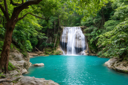Stunning erawan waterfall cascading into a turquoise pond surrounded by lush tropical rainforest in Kanchanaburi, Thailand