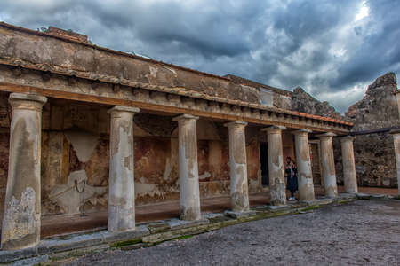 Ruins of antique roman temple in Pompeii, destroyed by eruption of Mount Vesuvius volcano in 79 AD, Naples, Italy. Ancient city of Pompeii. Remain of the forum colonnade. Pompeii archaeological site
