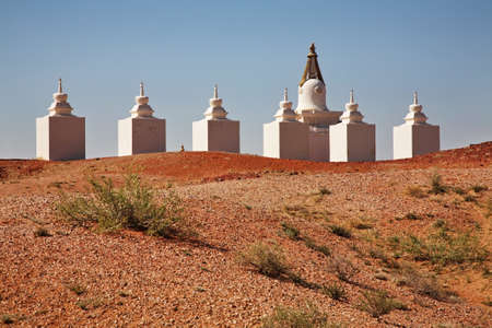 Small pagodas on a hilltop in the Gurvanbulag district of the Bulgan Province near Elsen Tasarkhai (aka Little Gobu), Mongolia.