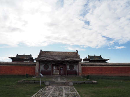Karakorum, Mongolia - August 29, 2019: Buddhist Lubang Gyalpo Temple with red fence in summertime on the steppe in Karakorum in Mongolia.