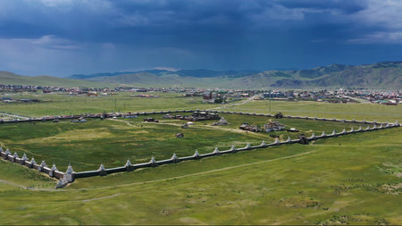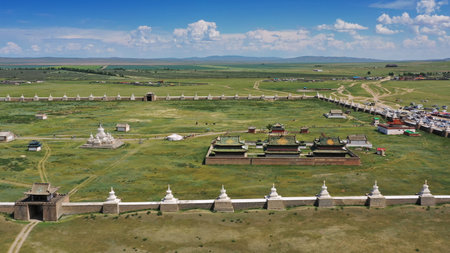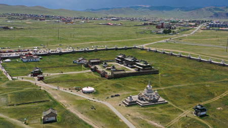 Aerial view of the Kharkhorin Erdene Zuu Monastery in Kharkhorin (Karakorum), Mongolia. Karakorum was the capital of the Mongol Empire between 1235 and 1260