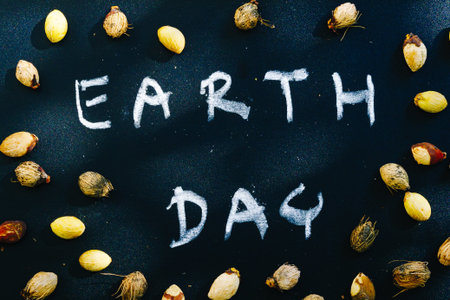 earth day concept, earth day word writing on chalkboard with nature seeds