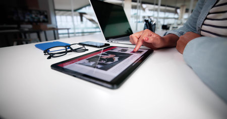 Side view, Female freelancer using a smart digital tablet touchpad in her home living room. close-up