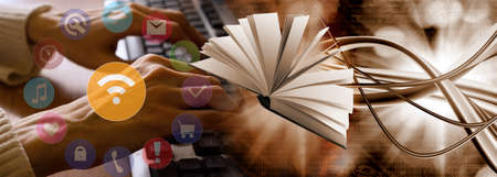 E-book reader with traditional books composition. Book reading with e-book device concept
