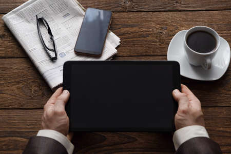 Top view on male hands holding a tablet, a cup of coffee and a morning newspaper. Work is all office. Business concept. Place for text