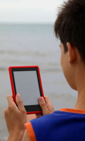 Brecht, Belgium - May 8 2018: A close up portrait of a person reading an e-book on an e-ink e-reader on a sunny day outside in the garden. An easy way to travel with a pocket sized library.