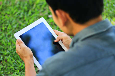 Anonymous guy in casual outfit sitting on green lawn and using modern tablet