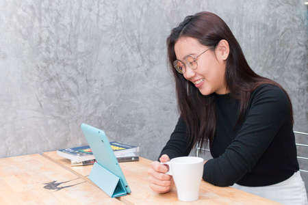 Asian teenager girl using tablet computer with coffee cup sitting in cafe,asian study girl relaxing in coffee shop,lifestyle concept