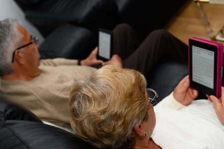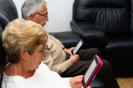 Woman and man read in an electronic book. They are sitting on the sofa at home