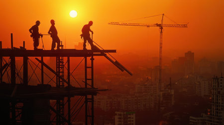 Construction workers silhouetted against a stunning sunset, highlighting teamwork and urban development in a city landscape.