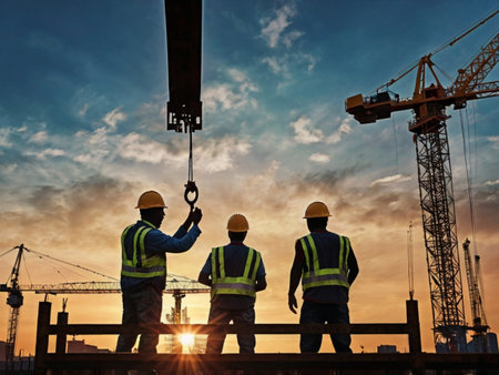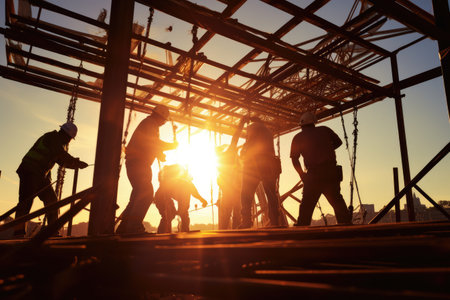 Construction workers collaborated on a site at sunset, demonstrating teamwork and effort in the building industry on Labor Day.