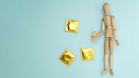 concept male contraception condom in jeans pocket top view.