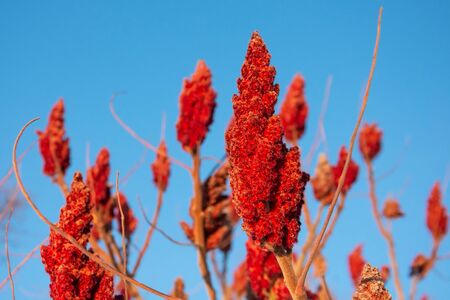 Bright red wood brush fruit of a staghorn sumac tree against the blue sky
