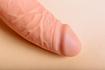 Natural shape of sex toy for woman close-up. Rubber penis. Sex vibrator on yellow background with copy space. BDSM object. Concept of male health. Banner.