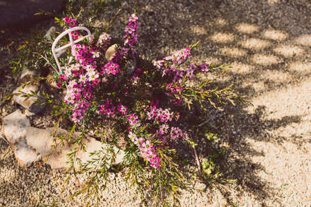 native Australian pink philotheca waxflower with flowers in sunny backyard shot at shallow depth of field