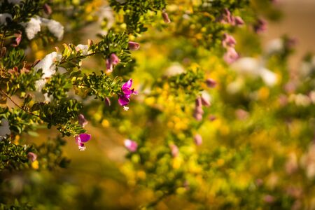 native Australian pink crowea plant with flower and golden leaves in winter in Australia
