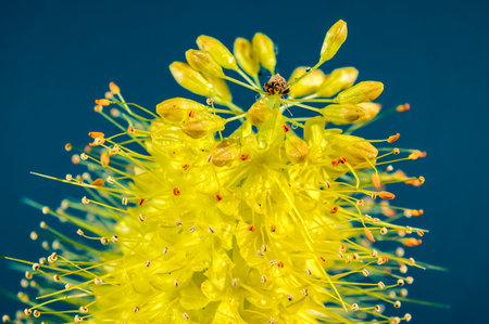 yellow Eremurus flower on a blue background. Flower head close-up.