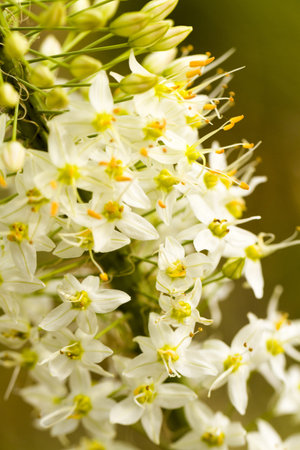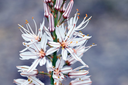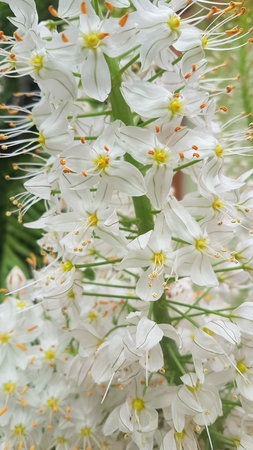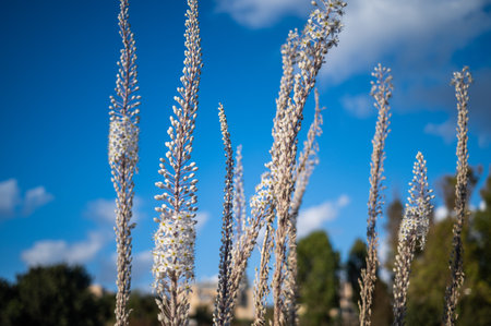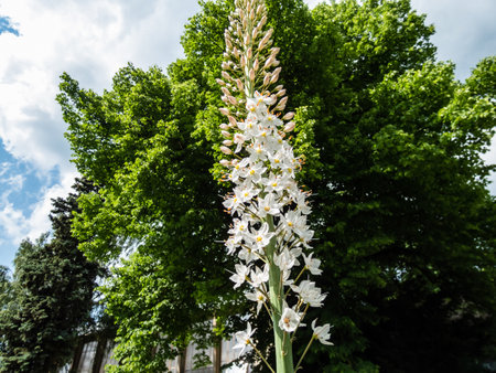 Urginea maritima bulbous tall flowering plant, sea squill maritime onion bright small white flowers in bloom