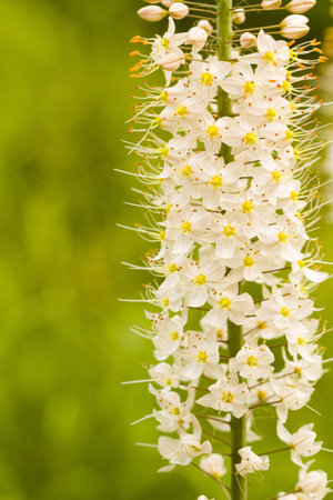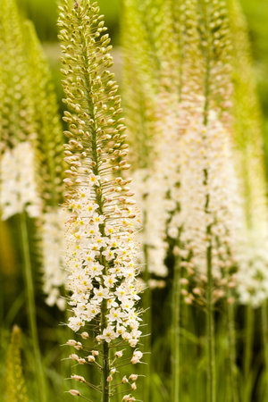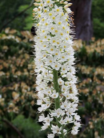 Eremurus himalaicus, with white flowers with yellow centers. Also known as Giant Desert Candle, defocused background