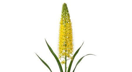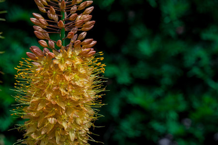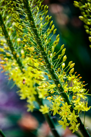 Pretty Eremurus stenophyllus, also known as the narrow-leaved foxtail lily or desert candle, It features soaring, slender spikes of dark yellow, star-shaped flowers. use it as your Wallpaper, Poster and Space for text, Selective focus.