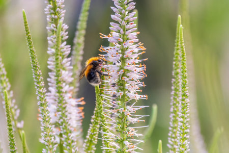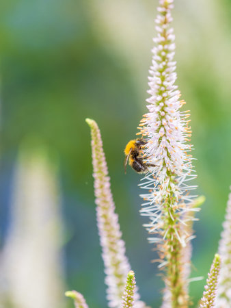 White Culver's root, Veronicastrum virginicum 'Alba', blooming in an autumn garden and giving nectar to bees, closeup with selective focus