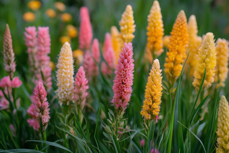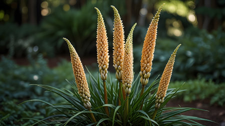 Torch lily flowers and broad-leafed plants in a serene garden setting. A vibrant image of Kniphofia flowers, featuring yellow blooms against a dark green backdrop, complemented by broad-leafed plants.