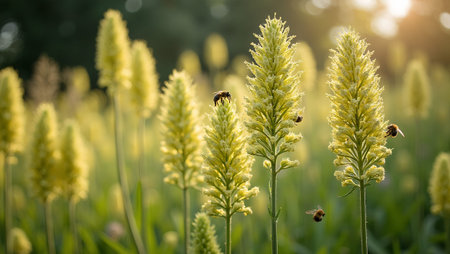 Delicate green spikes of grass bloom, capturing the essence of summer's vibrant beauty.