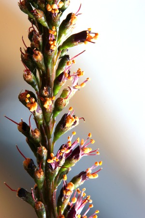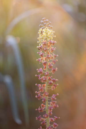 Close-up of a raceme of small pinky flowers illuminated by sunlight
